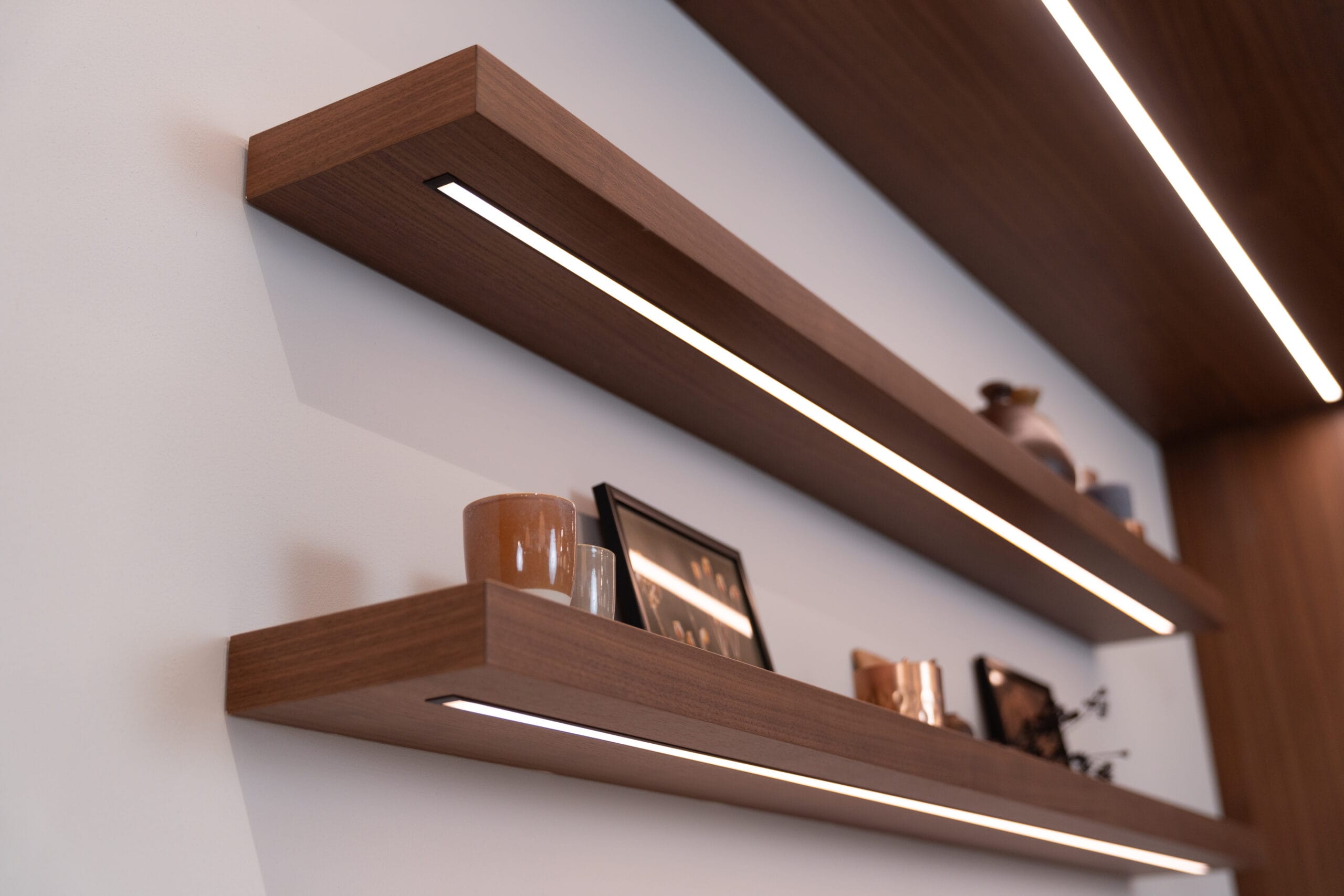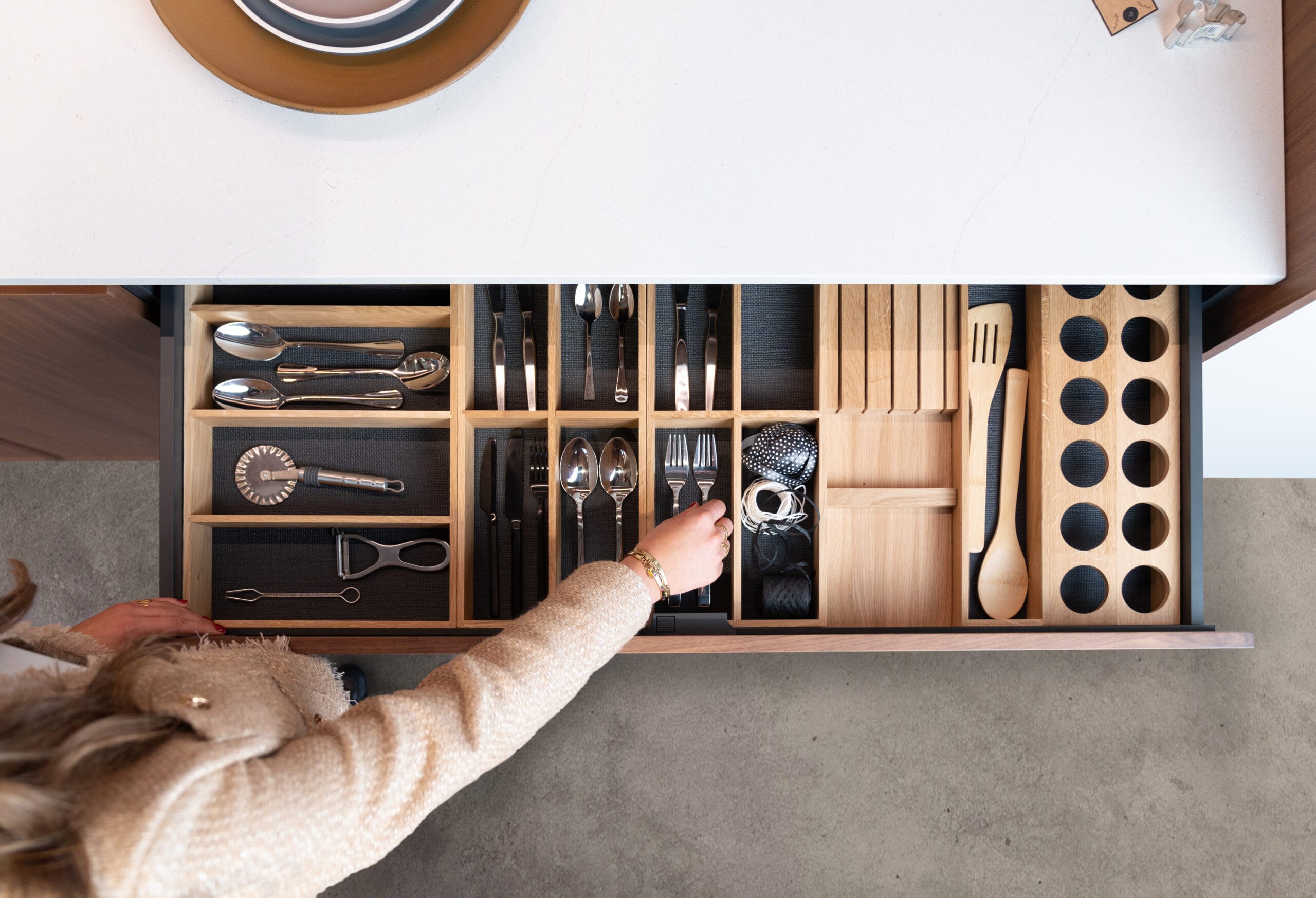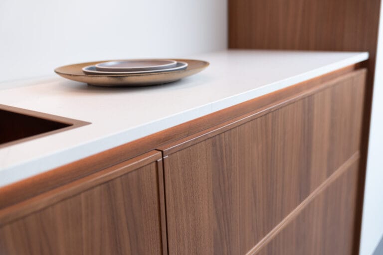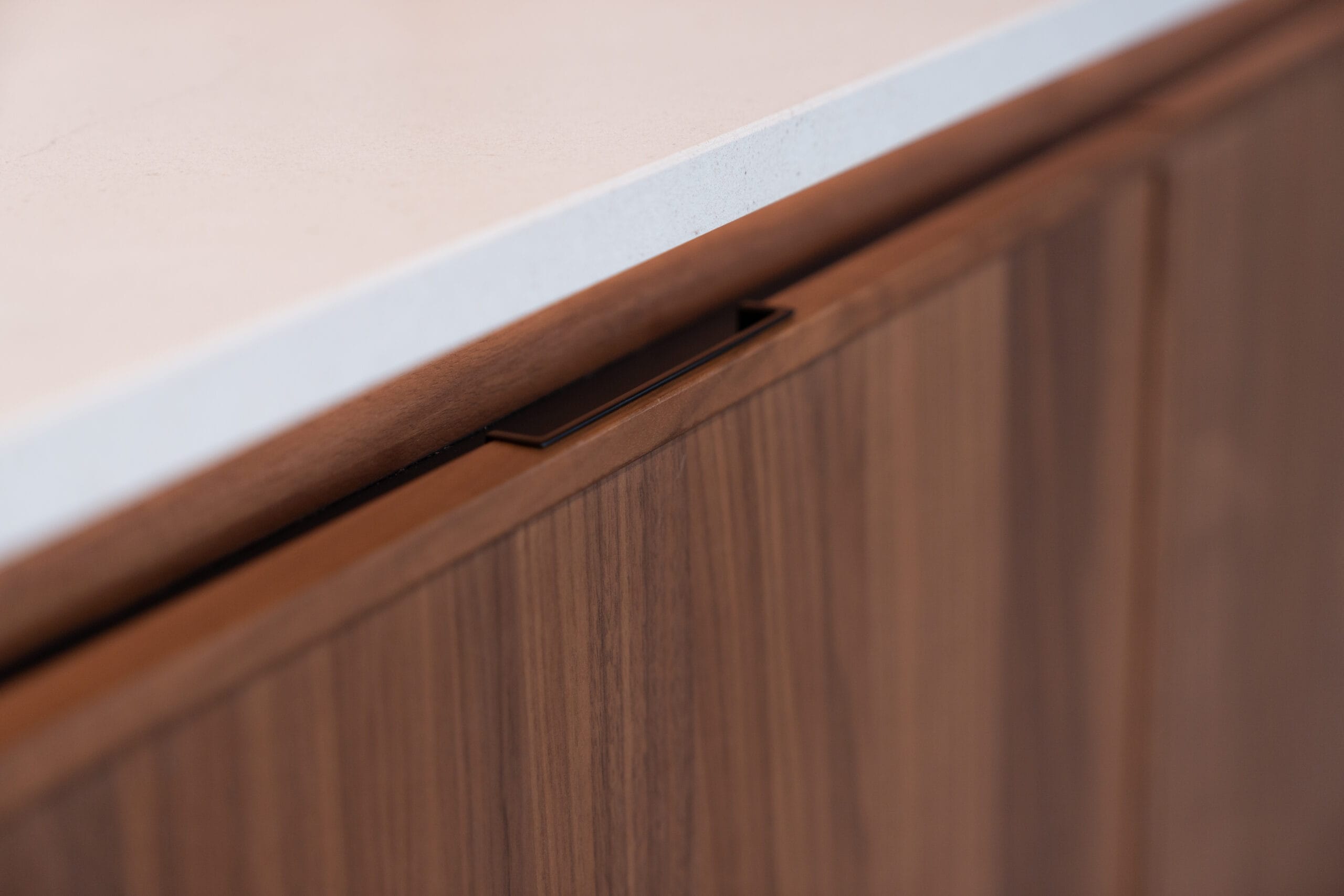 Val je voor chique, warm en een fraai lijnenspel? Dan is deze stijlvolle keuken, uitgevoerd in Smala Walnut, jou op het lijf geschreven. De keuken is greeploos; wat het mooie lijnenspel accentueert. Het smalle kader op de fronten is bijzonder. De ruime laden en kasten geven je alle ruimte voor het opbergen van je keukenspulletjes. De warme notenkleur past helemaal in de trend naar warmere en donkere kleuren in het interieur.