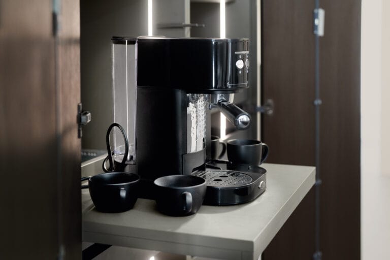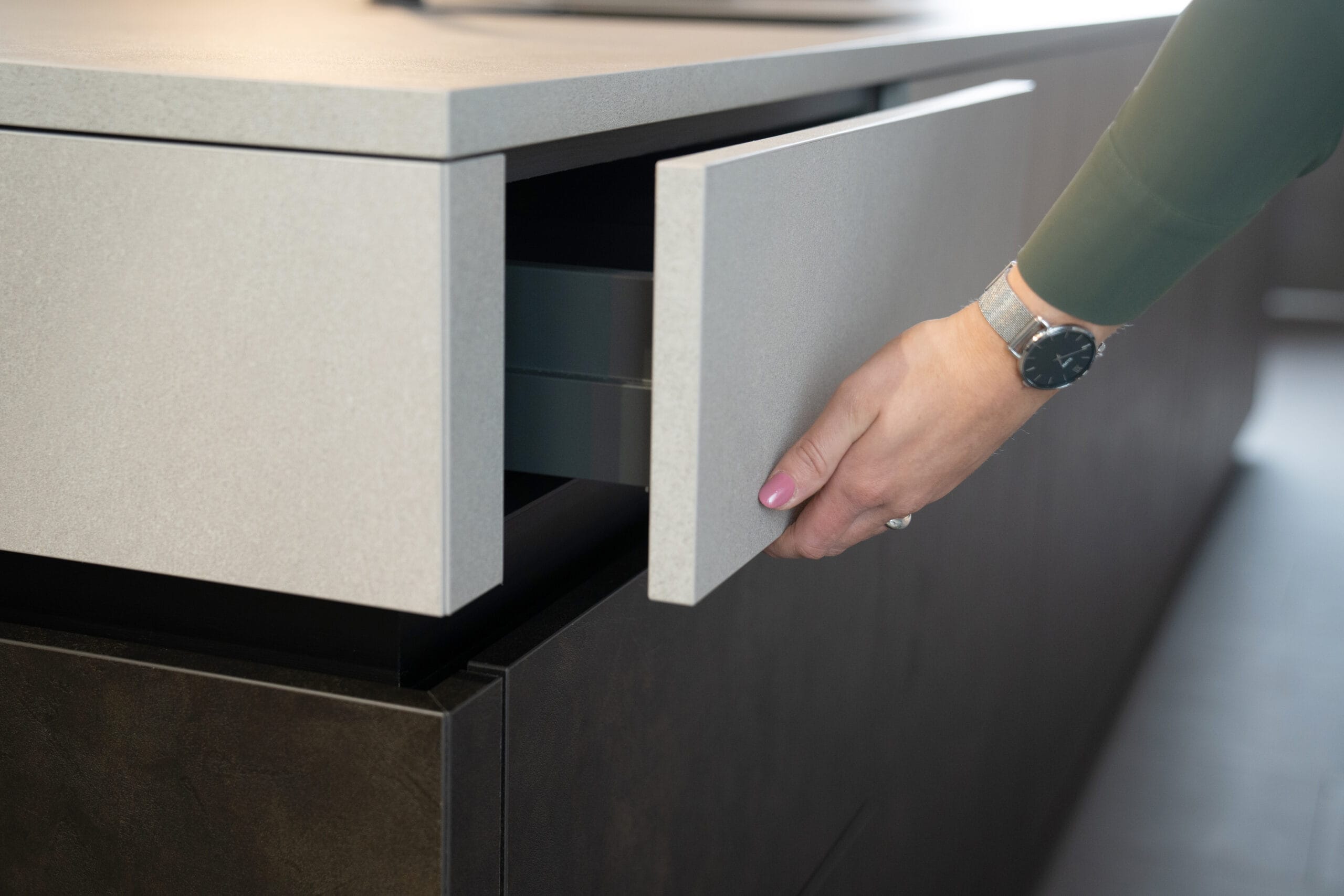 Donker hout is verre van saai en ouderwets! Deze symmetrische greeploze Loft Dark Oak keuken met royaal eiland bewijst het tegendeel. Handige greeploze push-to-open kasten en laden, een zee aan ruimte en desgewenst voorzien van handige koffiecorner of uittrekbare koffielade; deze keuken geeft je alles. Voer de keuken uit in één kleur of maak ‘m gedurfder met een contrasterend licht grey stone werkblad en ladesblendes voor de illusie van een stoer dik werkblad.