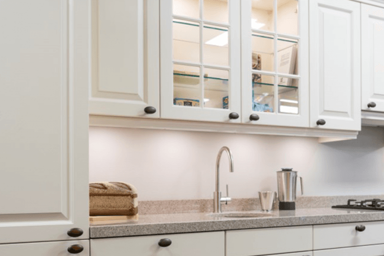 Deze stijl vraagt om natuursteen. Het lichte granietenwerkblad past dan ook perfect bij deze keuken. De geïntegreerde LED-verlichting zorgt niet alleen voor de gewenste hoeveelheid licht om prettig bij te werken, maar ook voor dat knusse sfeertje waarmee deze keuken geassocieerd wordt.