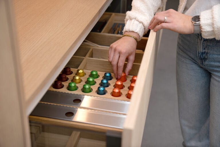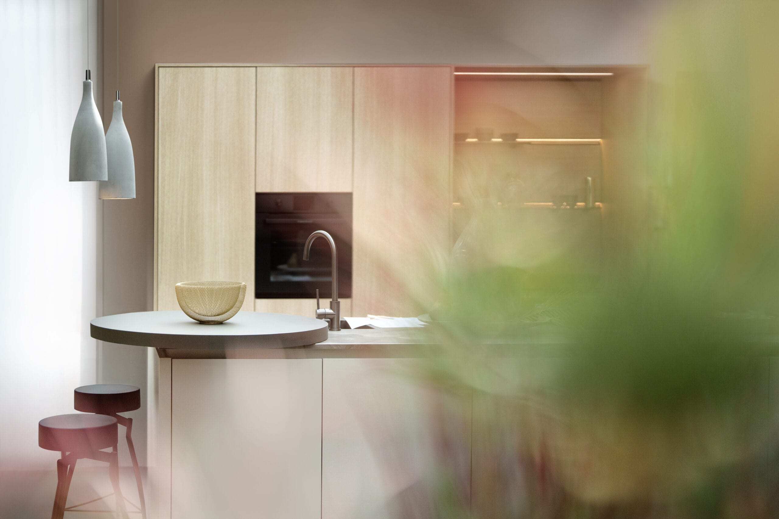 Deze keuken met opvallend rond bargedeelte straalt moderne elegantie uit; ideaal voor wie op zoek is naar een stijlvolle én functionele ruimte. Het lichte Loft Nordic Oak in combinatie met strakke, zachtgrijze kasten zorgt voor een minimalistische uitstraling, terwijl het ruime kookeiland met bar uitnodigt tot zowel koken als gezellige momenten met je gasten.