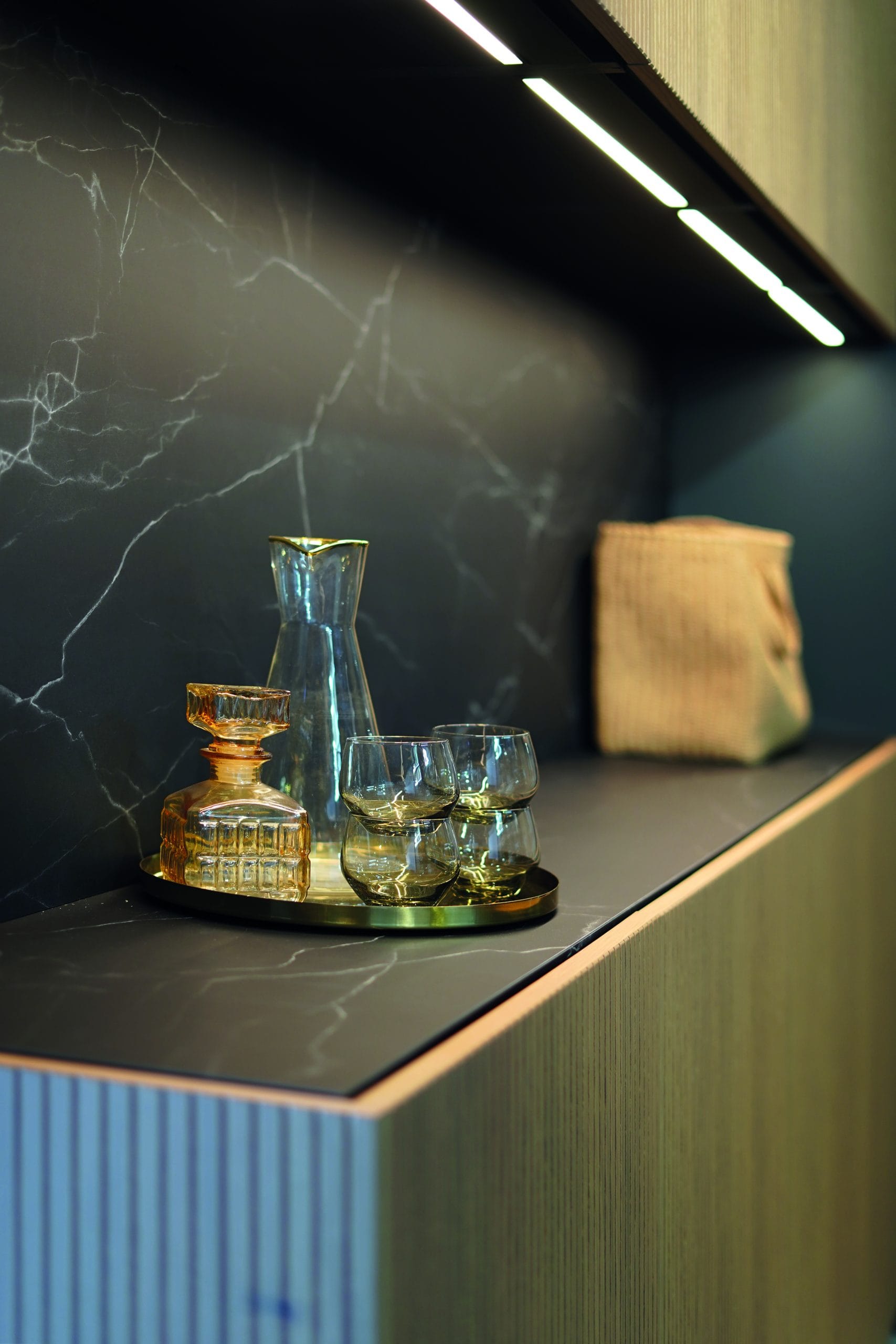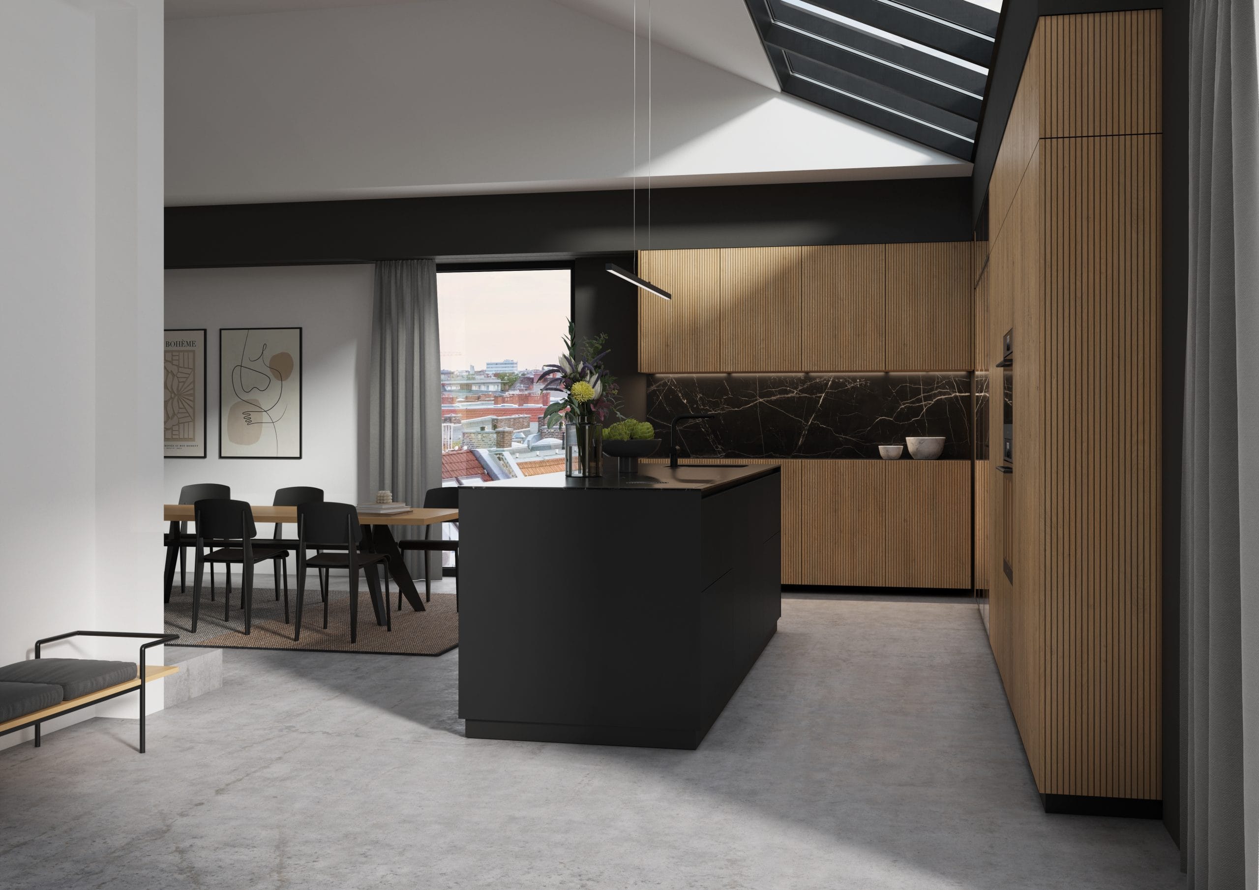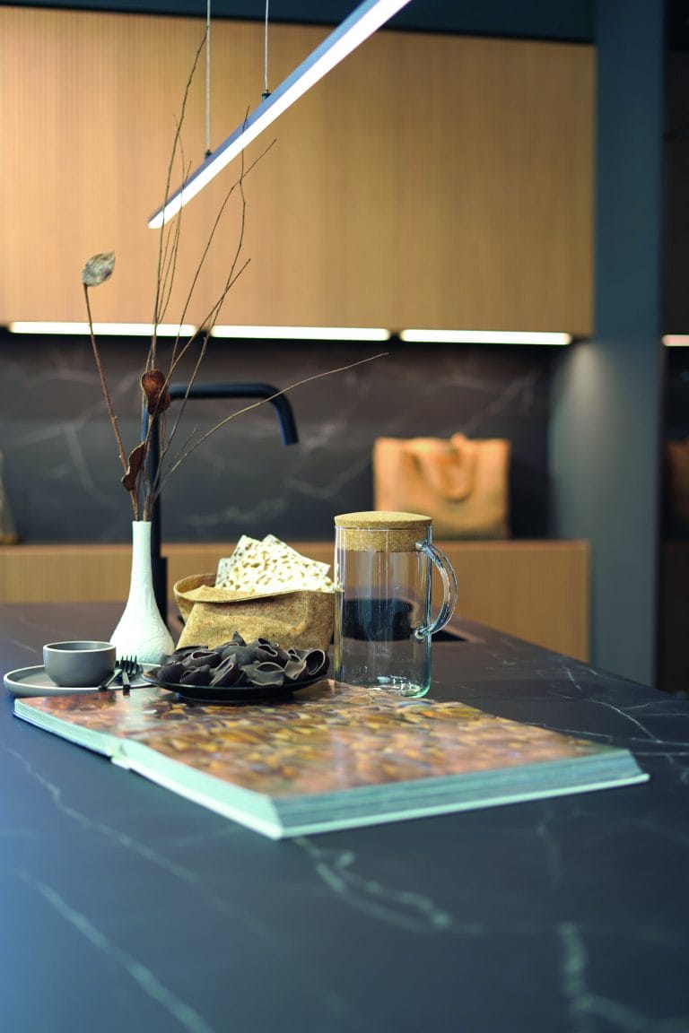 Achter deze combinatie van hout en zwart zit een zee aan mogelijkheden verborgen. Strakke lijnen, dichte kasten vol opbergruimte en een glaskast. Het kookeiland neemt een prominente plaats in en vormt het centrale middelpunt van deze stijlvolle keuken. Het geribbelde houten front geeft een speelse touch aan de verder strakke lijnen. En vingerafdrukken? Die krijgen geen kans op het matzwarte front met anti-fingerprint technologie!