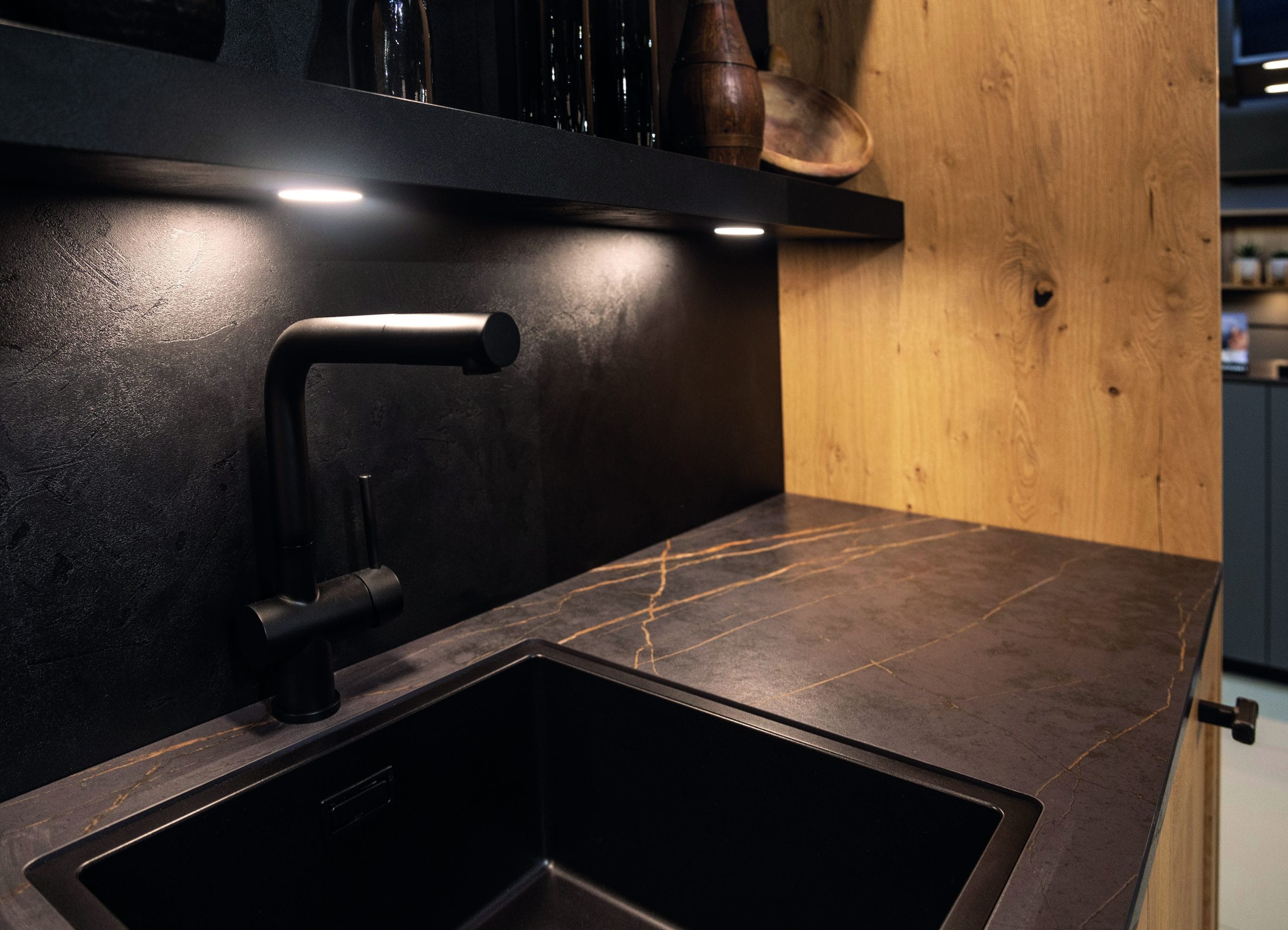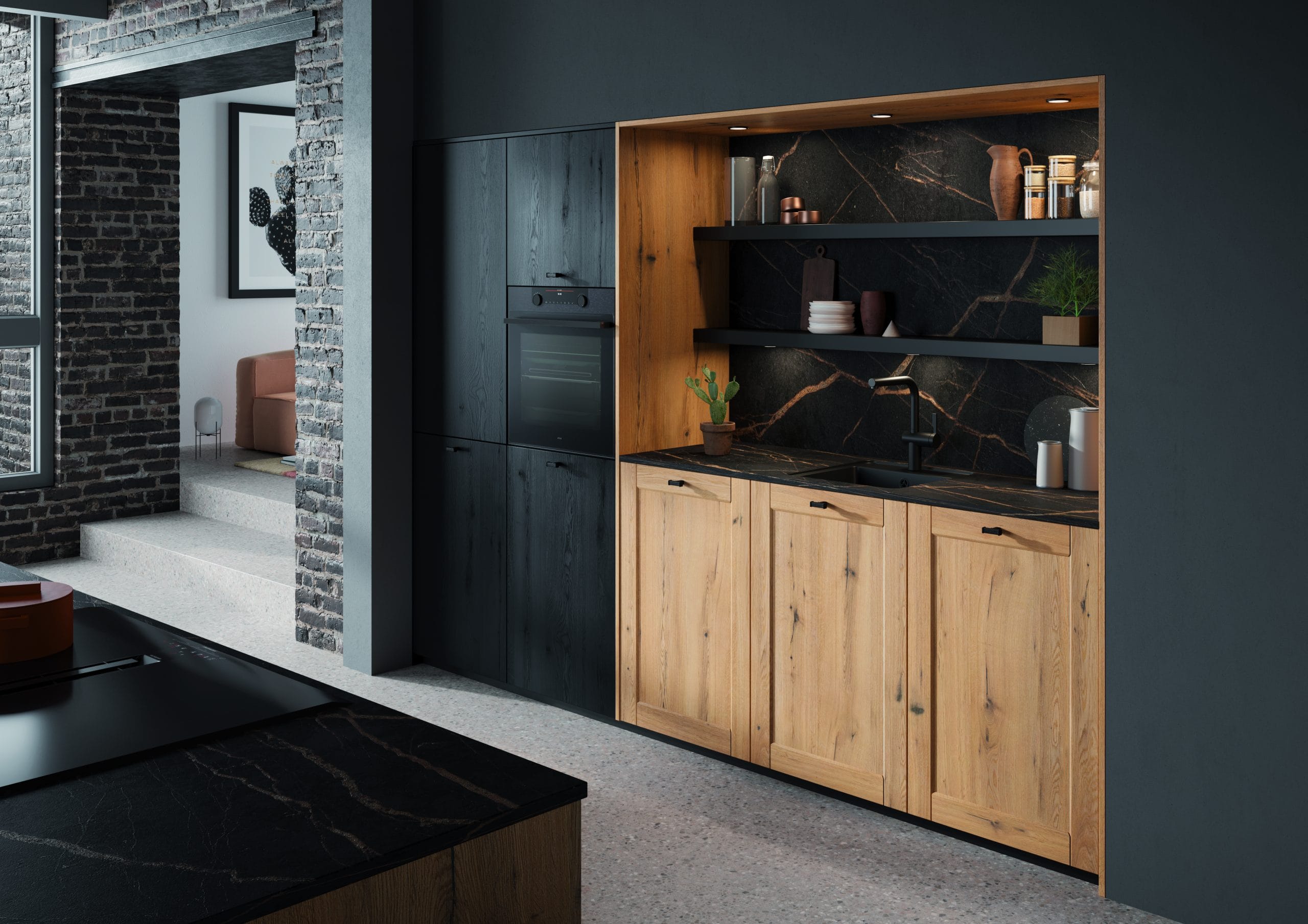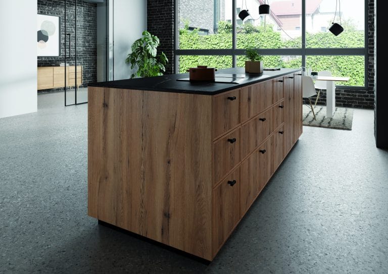 Achter deze combinatie van hout en zwart zit een zee aan mogelijkheden verborgen. Strakke lijnen, dichte kasten vol opbergruimte en wandplanken om je mooiste spullen ten toon te stellen. Het kookeiland neemt een prominente plaats in en vormt het centrale middelpunt van deze stijlvolle keuken.